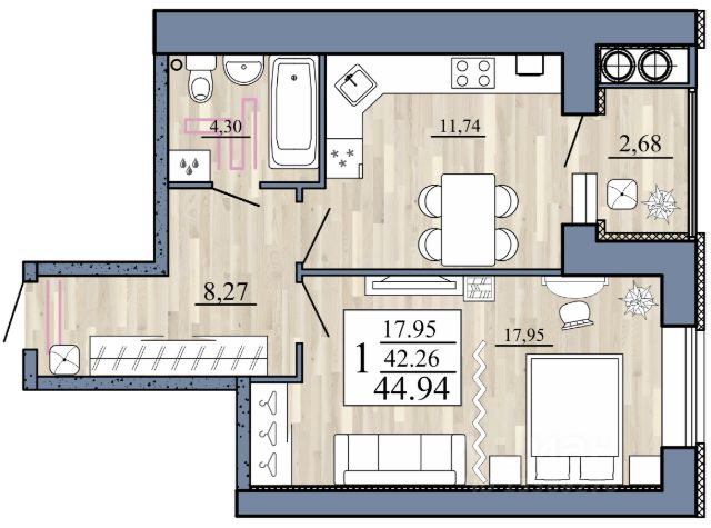 Квартира включает в себя вместительную кухню-гостиную 23,70 кв.м., где вы сможете проводить время с семьей и друзьями, а также комфортабельную комнату, обеспечивающую уединение и отдых.