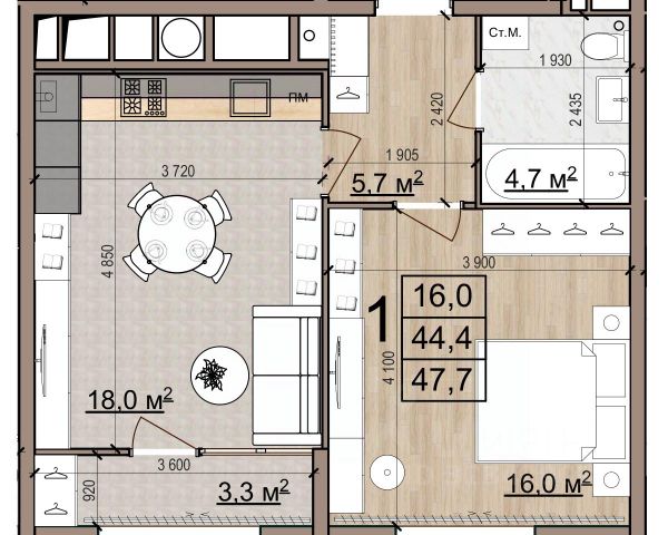 1 комн. квартира в ЖК Еврокласс-5, площадь 45.5 м², жилая 13.9 м², кухня 19.3 м²