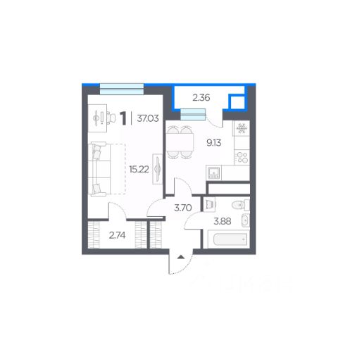 1 комн. квартира в ЖК Полярная Звезда, площадь 38.9 м², жилая 12.8 м², кухня 18 м²