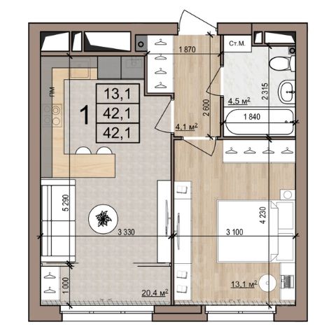 Продается уютная однокомнатная квартира в Рязани на улице Новосёлов, 21А. Общая площадь квартиры составляет 50 кв. м, из которых 18 кв. м отведено под жилую зону и просторные 20 кв. м занимает кухня. Квартира расположена на 6-м этаже 10-этажного кирпичного дома, построенного в 2007 году. Высота потолков — 2.7 метра.