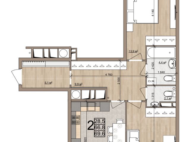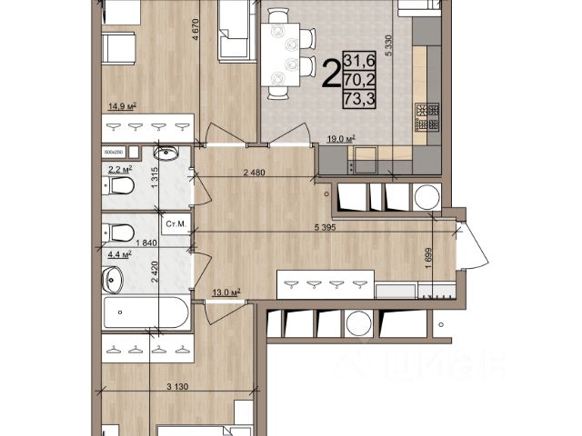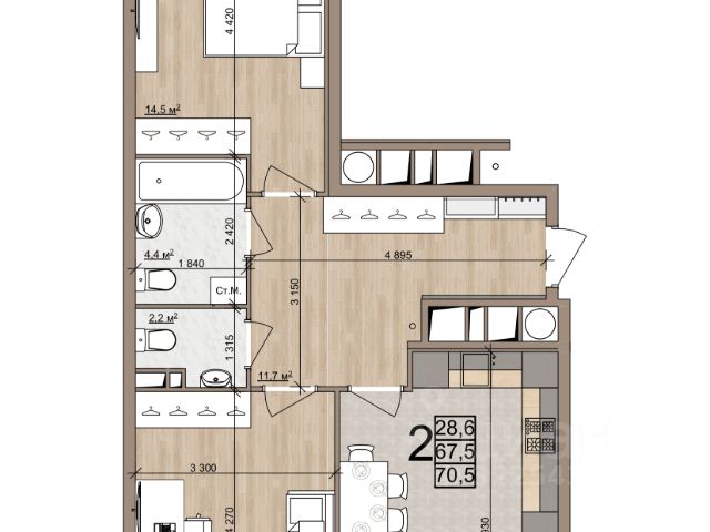 Квартира в современном, продуманном и отлично расположенном ЖК. Квартира в последнем 3 ем корпусе. Планировка Евро 3, с просторной кухней-гостиной в 23м.! и 2-мя полноценными спальнями, одна из которых мастер-спальня с окном в пол, большим сан/узлом и панорамной лоджией правильной формы, которую легко сделать теплой и функциональной! Внутри квартиры нет несущих стен, это позволяет изменить планировку по вашему желанию! Окна выходят на сторону бассейна, квартира очень светлая и теплая, стоят тепловые счетчики, это большая экономия на отоплении! Квартира расположена на комфортном 2-ом этаже, что освобождает вас от ожидания и поломки лифтов! Хороший вид из окон. На втором фото показан предполагаемый вариант перепланировки с расстановкой мебели по дизайн проекту. Второй санузел можно использовать как гардеробную или прачечную.
