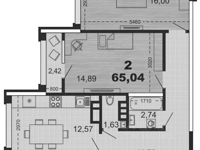 Квартира площадью 71,83 м² имеет две комнаты 19,26 м² и 16,23 м², планировка на разные стороны, а также кухню площадью 12,69 м².