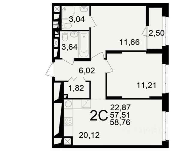 Квартира площадью 71,83 м² имеет две комнаты 19,26 м² и 16,23 м², планировка на разные стороны, а также кухню площадью 12,69 м².