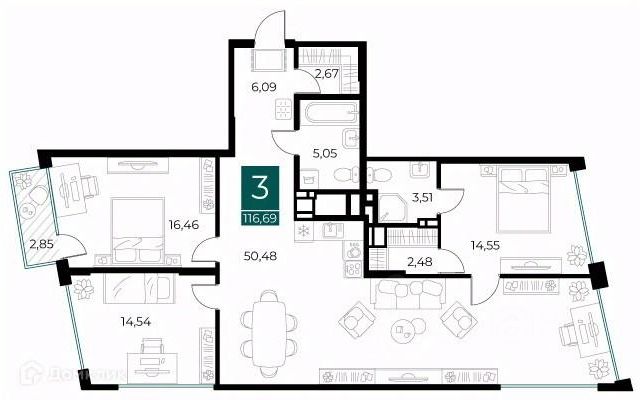 18,5 кв.м. кухня-гостиная, два санузла - один с/у из мастер -спальни (с окном), две просторные комнаты, гардеробная. Высота потолков -3,05м.