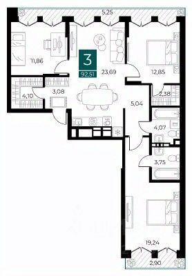 жилая площадь -39,3 (11,7+12,3+15,3) кв м,