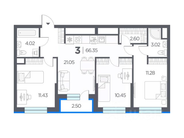18,5 кв.м. кухня-гостиная, два санузла - один с/у из мастер -спальни (с окном), две просторные комнаты, гардеробная. Высота потолков -3,05м.