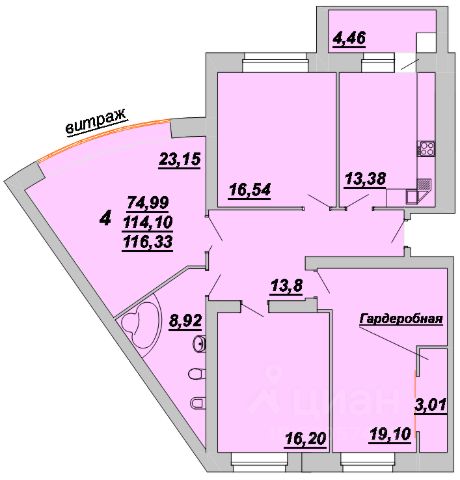Квартира площадью 71,83 м² имеет две комнаты 19,26 м² и 16,23 м², планировка на разные стороны, а также кухню площадью 12,69 м².