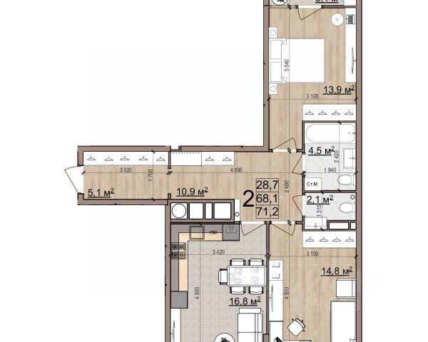 2 комн. квартира в ЖК Еврокласс-5, площадь 71.2 м², жилая 28.7 м², кухня 16.8 м²