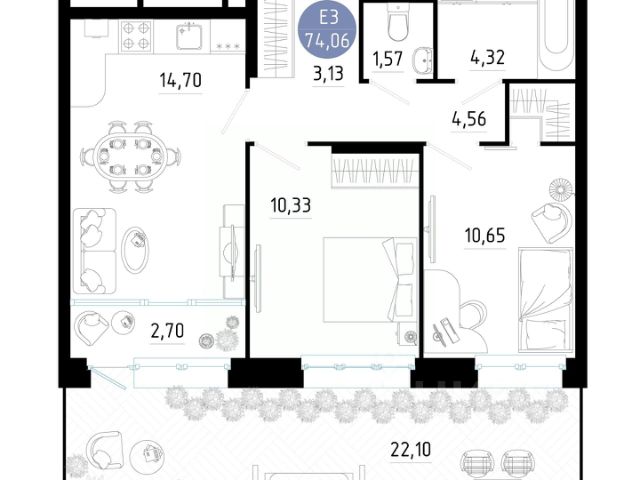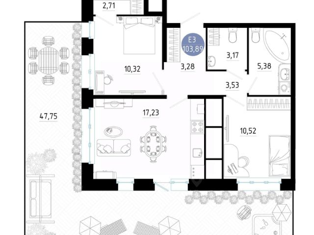 Озеленение кровли. В доме предусмотрена эксплуатируемая кровля с элементами озеленения, доступ к которой получает владелец данной квартиры.