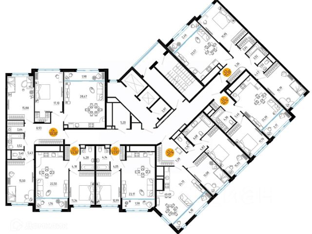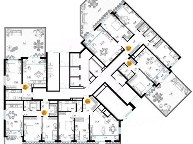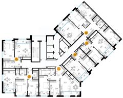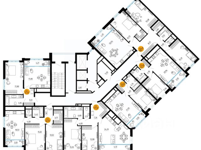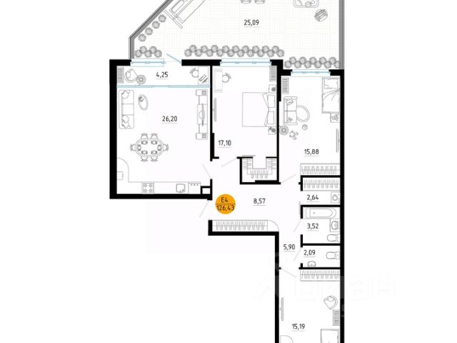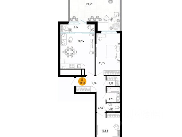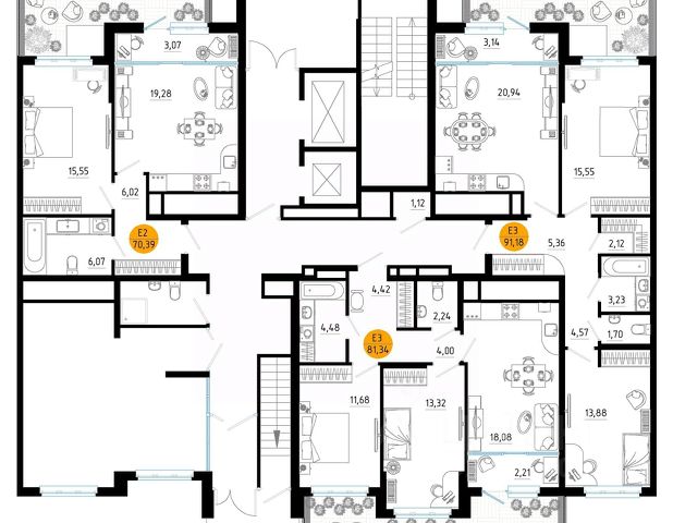 Эргономичная смарт-планировка с просторной кухней-гостиной (30 м. кв.), мастер-спальней (15,2 кв. м.) и гардеробной (2,1 м. кв.), комнаты 15,2 м. кв., 15,2 м. кв.,14,1 м. кв. правильной формы. В квартире есть два санузла. Высокие потолки (2,7 м) наполняют комнаты воздухом и светом.