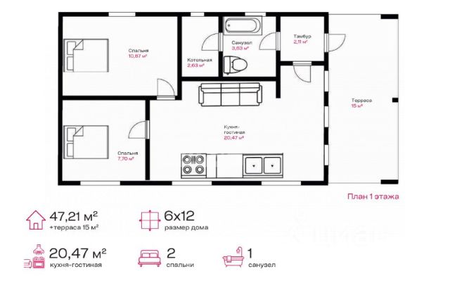 Общая площадь дома составляет 80,3 кв. м, из которых 49,8 кв. м — жилая площадь. В доме четыре комнаты, площадь которых составляет 10,5 + 10,2 + 14,2 + 14,9 кв. м, кухня 16,9 кв. м, ванна и с/у раздельные. Высота потолков — 2,7 м, что создаёт ощущение простора и свободы. Дом идеально подойдёт для семьи с детьми или пожилых пар, которые ценят комфорт и уют. За домом есть свободный участок которым можно воспользоваться для своих нужд. Дом в жилом состоянии, больших вложений не требует, заходи - живи.