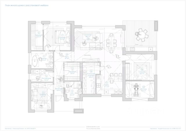 Современный архитектурный стиль и технологические решения. Проект архитектора Андрея Колесникова - члена союза архитекторов России. В доме по проекту 3 изолированные комнаты: 1 мастер спальня с гардеробной и с/у, 2 изолированные комнаты, гардеробная, постирочная, котельная /кладовая, кухня (17,1 кв.м) и просторная гостинная (33,5 кв.м).