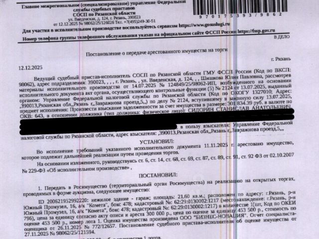 Данные получены с сайта ГИС Торги. Здание, назначение: нежилое, наименование: гаражный бокс, площадь 21,6 кв.м, кадастровый номер 62:29:0130002:1217, адрес: г.Рязань, р-н Южный Промузел, 16, а/к "Комета", бокс 478. Здание расположено в пределах земельного участка с кадастровым номером 62:29:0130002:269, сведениями о правообладателе Организатор торгов не располагает. Взыскатель: УФНС по Рязанской области. Начальная цена: 453 500 (Четыреста пятьдесят три тысячи пятьсот) руб. 00 коп., без НДС. Задаток: 220 000 (Двести двадцать тысяч) руб. 00 коп. Шаг аукциона 1%: 4 535 (Четыре тысячи пятьсот тридцать пять) руб. 00 коп.