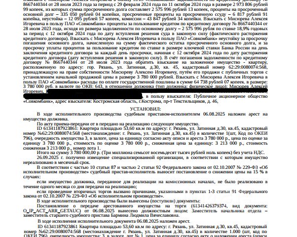 Данные получены с сайта ГИС Торги. Помещение, назначение: жилое, наименование: квартира, площадь 53,6 кв.м, кадастровый номер 62:29:0080074:568, местоположение: Рязанская область, г. Рязань, ул. Затинная, д. 30, кв. 45. Согласно справке ООО "Р-Энергия" от 11.08.2025 г. по данному адресу зарегистрированных лиц нет, задолженность по взносам на капитальный ремонт составляет 24 819,20 руб. Залогодержатель: ПАО "Совкомбанк". Начальная цена: 3 213 000 (Три миллиона двести тринадцать тысяч) руб. 00 коп., без НДС. Задаток: 150 000 (Сто пятьдесят тысяч) руб. 00 коп.; Шаг аукциона 1%: 32 130 (Тридцать две тысячи сто тридцать) руб. 00 коп.
