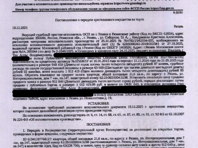 Данные получены с сайта ГИС Торги. Помещение, назначение: жилое, наименование: квартира, площадь 21,6 кв.м., кадастровый номер 62:29:0020004:3298, местоположение: Рязанская область, г. Рязань, ул. Интернациональная, д. 7а, кв. 147. Согласно справке ООО "Р-Энергия" от 25.12.2025 г. по данному адресу зарегистрировано 5 человек, задолженность по взносам на капитальный ремонт составляет 11 751,72 руб. Залогодержатель: ПАО "Сбербанк России". Начальная цена: 912 640 (Девятьсот двенадцать тысяч шестьсот сорок) руб. 00 коп., без НДС. Задаток: 40 000 (Сорок тысяч) руб. 00 коп. Шаг аукциона 1%: 9 126 (Девять тысяч сто двадцать шесть) руб. 40 коп.