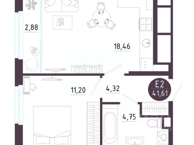 1 комн. квартира в ЖК Крылья, площадь 41.61 м², жилая 11.2 м², кухня 18.46 м²