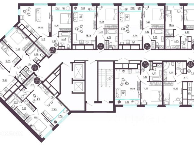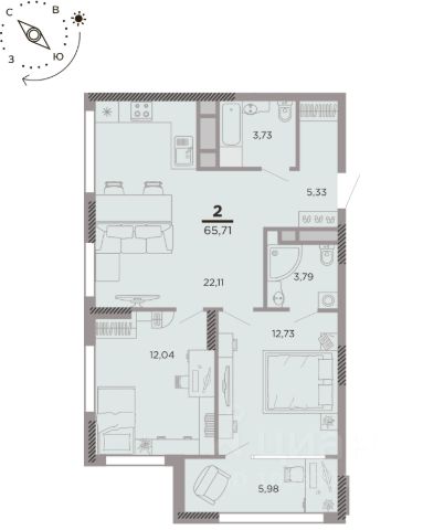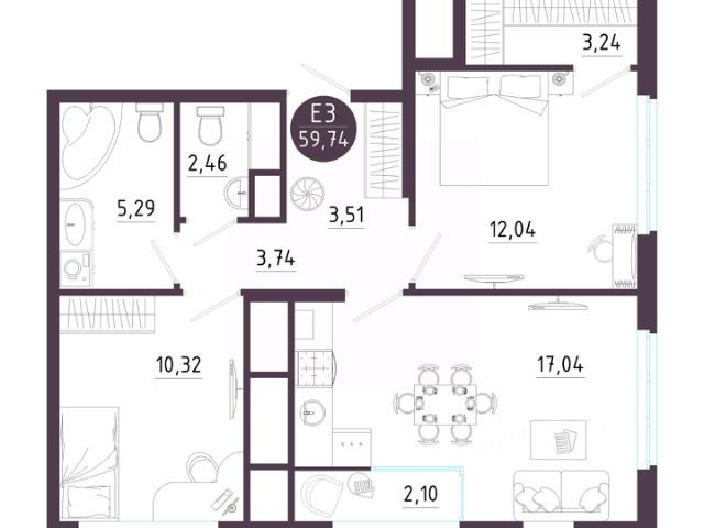 2 комн. квартира в ЖК Крылья, площадь 59.74 м², жилая 22.36 м², кухня 17.06 м²