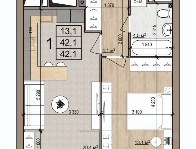 1 комн. квартира в ЖК Полярная Звезда, площадь 42.1 м², жилая 13.1 м², кухня 20.4 м²