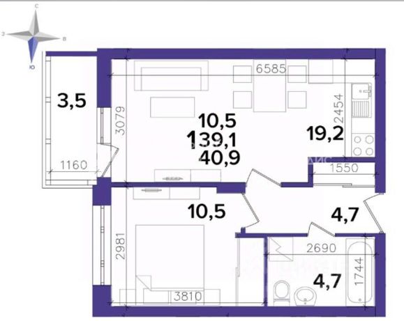 - Кухня-гостиная 19,2 кв.м + 3,5 лоджия кв.м