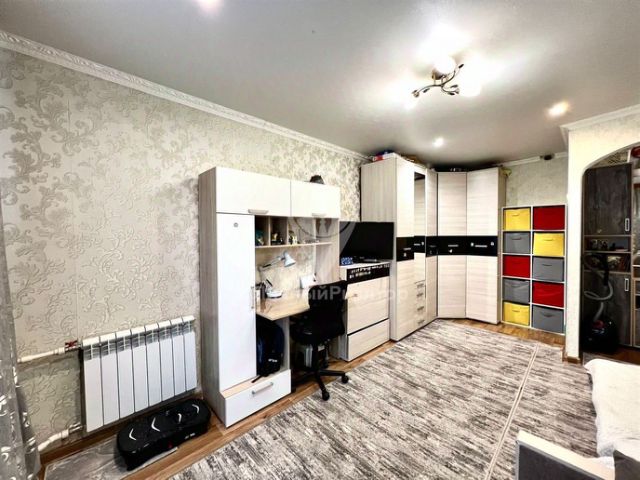 В комнате находится диван, который легко трансформируется в спальное место, просторный шкаф-купе, телевизор 54, кондиционер. Для освещения квартиры применены световые линии и трековые светильники, с которыми Вы легко можете менять направления и яркость освещения.