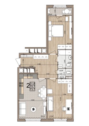 Oбщая проектная площадь квapтиpы 64,8 м2, в том числе кухня-гостиная 19,5 кв.м. (с учетом теплой лоджии), мастер-спальня 15 кв.м. с шикарным собственным сан узлом 5,9 кв.м., спальня 13,2 кв.м, общий сан. узел 3 кв.м и гардеробная.