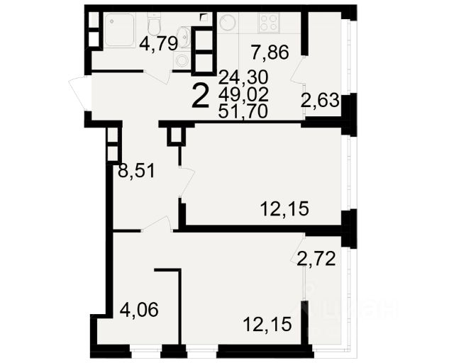 2 комн. квартира в ЖК Аура, площадь 50.58 м², жилая 20.96 м², кухня 14.64 м²