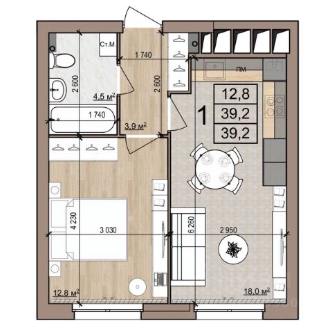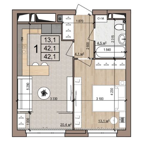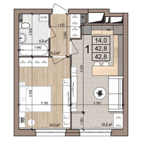 Квартира 5, 1-комнатная в ЖК Полярная звезда от компании "Зеленый сад". Московский район, развитая инфраструктура. Купить квартиру в новостройке в Рязани: 42.8 кв.м., 2 этаж. Кухня — 19.8 кв.м. Ипотека, Trade-In. Подробности на нашем сайте