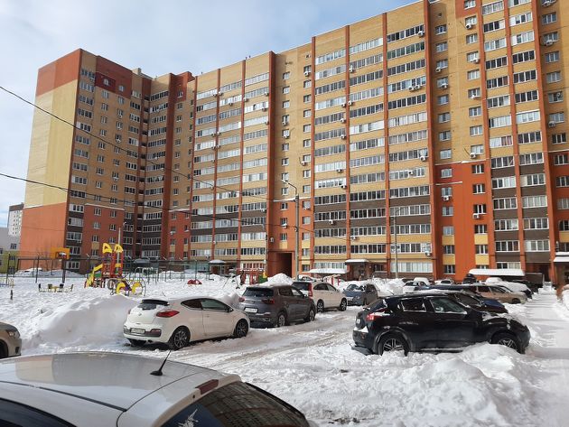 Двор с большим количеством парковочных мест, современными детскими и спортивными площадками.