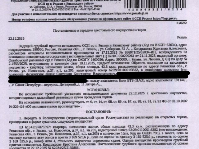 Данные получены с сайта ГИС Торги. Помещение, назначение: жилое, наименование: квартира, площадь 43,3 кв.м., кадастровый номер 62:29:0110001:3382, адрес: Российская Федерация, Рязанская область, г.о. город Рязань, г Рязань, ул Новоселов, д. 37 к. 1, кв. 205. Сведениями о зарегистрированных по данному адресу лицах Организатор торгов не располагает. Согласно справке ООО "Р-Энергия" от 20.01.2026 г. задолженность по взносам на капитальный ремонт отсутствует. Залогодержатель: Банк ВТБ (ПАО). Начальная цена: 3 169 525 (Три миллиона сто шестьдесят девять тысяч пятьсот двадцать пять) руб. 60 коп., без НДС. Задаток: 150 000 (Сто пятьдесят тысяч) руб. 00 коп. Шаг аукциона 1%: 31 695 (Тридцать одна тысяча шестьсот девяносто пять) руб. 26 коп.