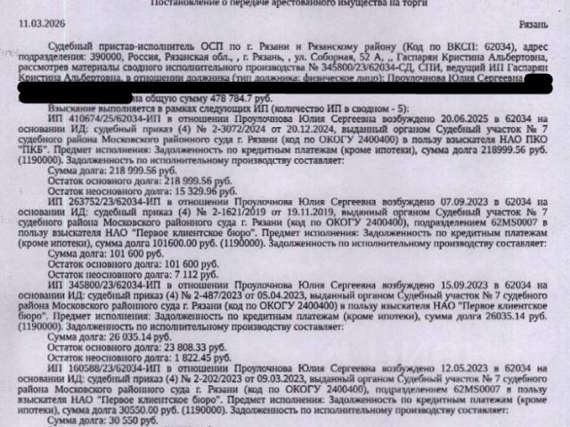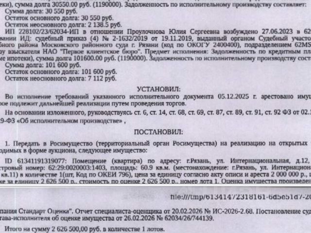 Данные получены с сайта ГИС Торги. Помещение, назначение: жилое, наименование: квартира, площадь 38,8 кв.м., кадастровый номер 62:29:0060011:1136, местоположение: г.Рязань, ул.Костычева, д.7 к.2, кв.105. Сведениями о зарегистрированных по данному адресу лицах, а также о задолженности по взносам на капитальный ремонт Организатор торгов не располагает. Взыскатель: НАО ПКО "Первое клиентское бюро". Начальная цена: 3 116 400 (Три миллиона сто шестнадцать тысяч четыреста) руб. 00 коп., без НДС. Задаток: 1 500 000 (Один миллион пятьсот тысяч) руб. 00 коп. Шаг аукциона 1%: 31 164 (Тридцать одна тысяча сто шестьдесят четыре) руб. 00 коп.