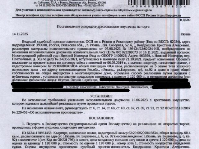 Данные получены с сайта ГИС Торги. Помещение, назначение: жилое, наименование: квартира, площадь 60,4 кв.м., кадастровый номер 62:29:0020004:5834, местоположение: г.Рязань, ул.Бирюзова, д.6, кв.92. Согласно справке ООО "Р-Энергия" от 20.11.2025 г. по данному адресу зарегистрировано 3 человека, задолженность по взносам на капитальный ремонт составляет 74 846,22 руб. Залогодержатель: Говорухин Д.В. Начальная цена: 1 120 000 (Один миллион сто двадцать тысяч) руб. 00 коп., без НДС. Задаток: 50 000 (Пятьдесят тысяч) руб. 00 коп. Шаг аукциона 1%: 11 200 (Одиннадцать тысяч двести) руб. 00 коп.