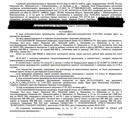 Данные получены с сайта ГИС Торги. Помещение, назначение: жилое, наименование: квартира, площадь 56,3 кв.м, кадастровый номер 62:11:0090416:779, местоположение: Рязанская обл., Пронский р-н, д. Мамоново, ул. Школьная, 21, кв.2. Согласно справке ООО "Р-Энергия" от 25.07.2025 г. по данному адресу зарегистрирован 1 человек. Сведениями о задолженности по взносам на капитальный ремонт Организатор торгов не располагает. Взыскатель: ИП Инюшин К.А. Начальная цена: 568 310 (Пятьсот шестьдесят восемь тысяч триста десять) руб. 00 коп., без НДС. Задаток: 280 000 (Двести восемьдесят тысяч) руб. 00 коп. Шаг аукциона 1%: 5 683 (Пять тысяч шестьсот восемьдесят три) руб. 10 коп. Квартира со свободной планировкой в Рязанской области.