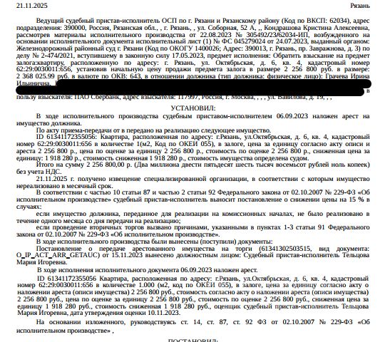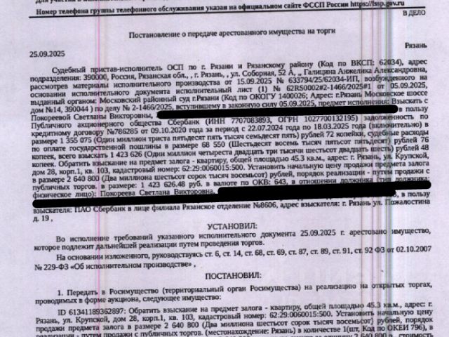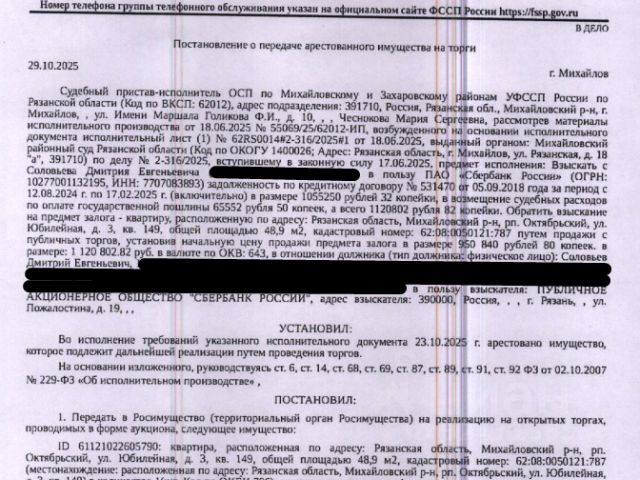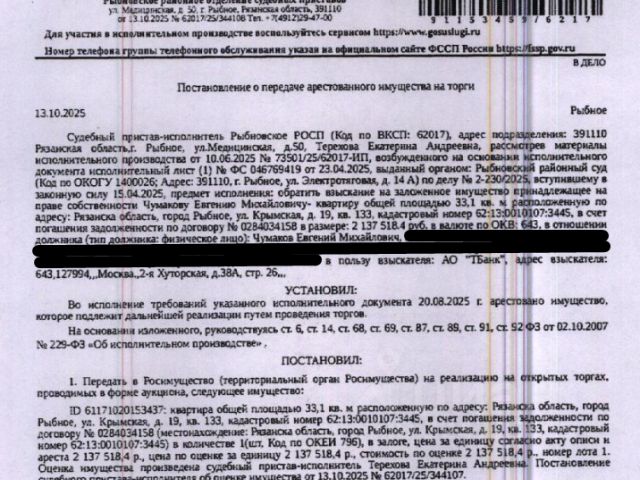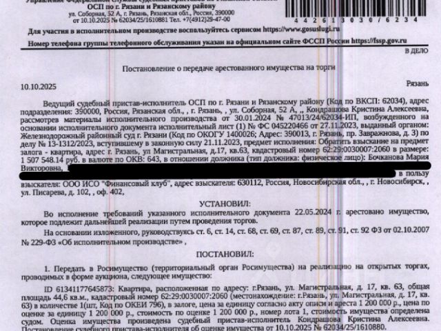 Данные получены с сайта ГИС Торги. Помещение, назначение: жилое, наименование: квартира, площадь 44,6 кв.м., кадастровый номер 62:29:0030007:2060, местоположение: г.Рязань, Магистральная ул., д.17, кв.63. Согласно справке ООО "Р-Энергия" от 31.10.2025 г. по данному адресу зарегистрировано 2 человека, задолженность по взносам на капитальный ремонт отсутствует. Залогодержатель: ООО ИСО "Финансовый клуб". Начальная цена: 1 200 000 (Один миллион двести тысяч) руб. 00 коп., без НДС. Задаток: 50 000 (Пятьдесят тысяч) руб. 00 коп. Шаг аукциона 1%: 12 000 (Двенадцать тысяч) руб. 00 коп. Продается квартира со свободной планировкой в Рязанской области.