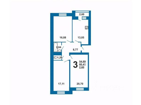 Общая площадь квартиры 60,5 кв. м, жилая площадь - 35,2 кв. м (3 комнаты прямоугольной формы 11,5; 11,8; 11,9 кв. м), кухня - 9,3 кв. м, коридор - 11,8 кв. м, санузел - 4,2 кв. м.