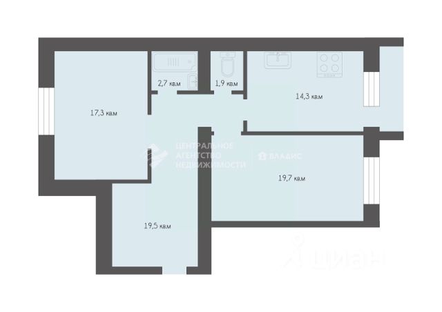 Общая площадь квартиры 60,5 кв. м, жилая площадь - 35,2 кв. м (3 комнаты прямоугольной формы 11,5; 11,8; 11,9 кв. м), кухня - 9,3 кв. м, коридор - 11,8 кв. м, санузел - 4,2 кв. м.