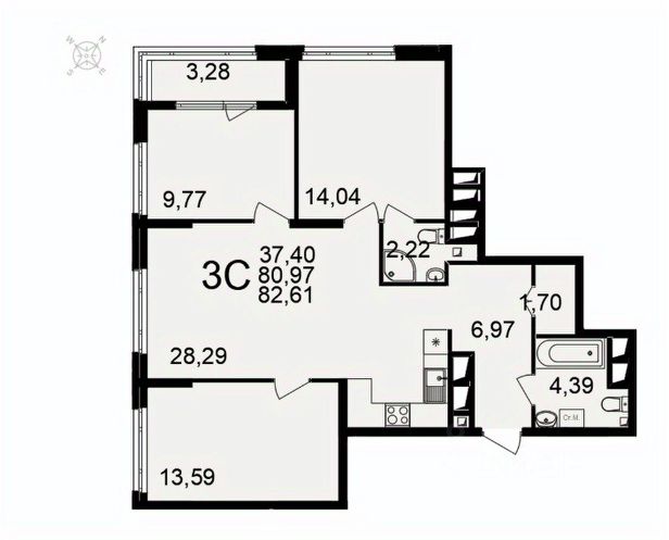 3 комн. квартира в ЖК Большая история, площадь 82.61 м², жилая 37.4 м², кухня 28.29 м²