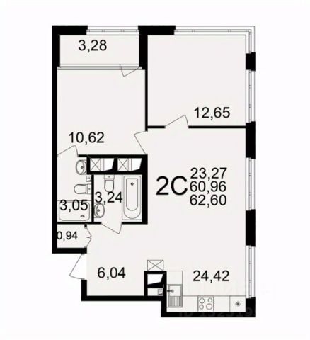 2 комн. квартира в ЖК Большая история, площадь 62.6 м², жилая 23.27 м², кухня 24.42 м²