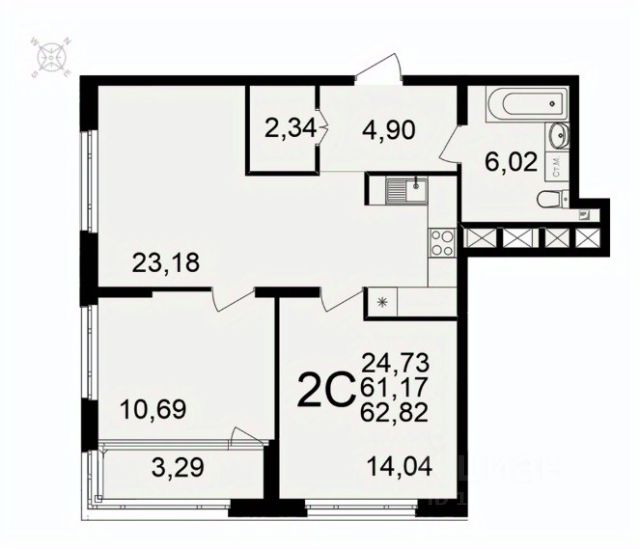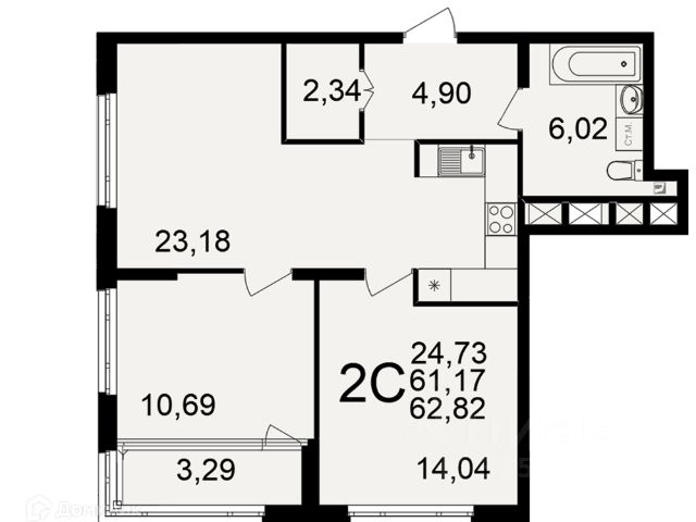 2 комн. квартира в ЖК Большая история, площадь 62.82 м², жилая 24.73 м², кухня 23.18 м²