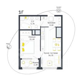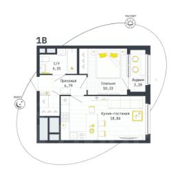 Общая площадь квартиры составляет 43,9 кв.м, плюс лоджия 3,2 кв.м.