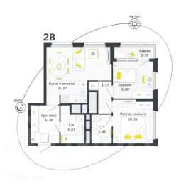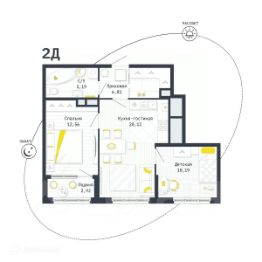 2 комн. квартира в ЖК Космос, площадь 69.34 м², жилая м², кухня м²