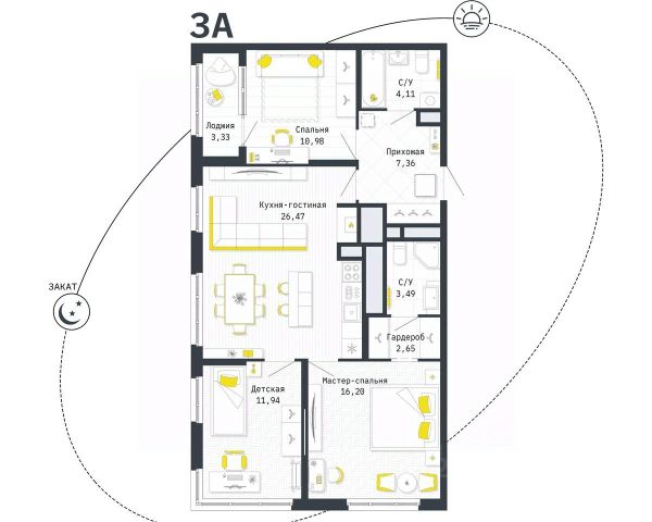 3 комн. квартира в ЖК Космос, площадь 84.87 м², жилая м², кухня м²