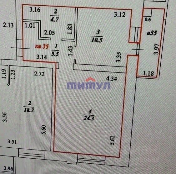 Общая площадь квартиры 60,5 кв. м, жилая площадь - 35,2 кв. м (3 комнаты прямоугольной формы 11,5; 11,8; 11,9 кв. м), кухня - 9,3 кв. м, коридор - 11,8 кв. м, санузел - 4,2 кв. м.