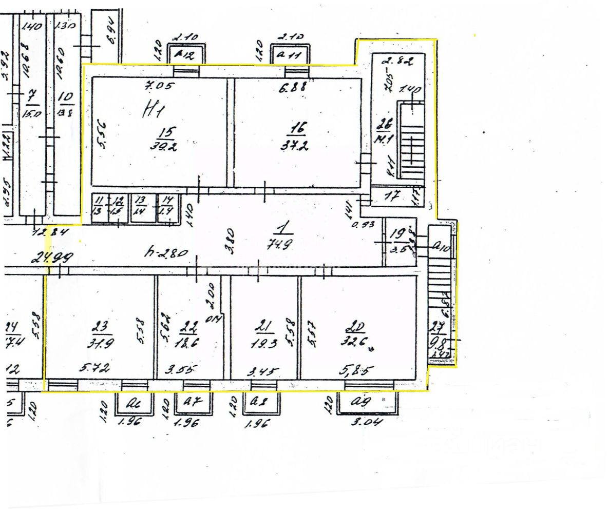 Офисное помещение расположено на цокольном этаже пятиэтажного кирпичного здания.