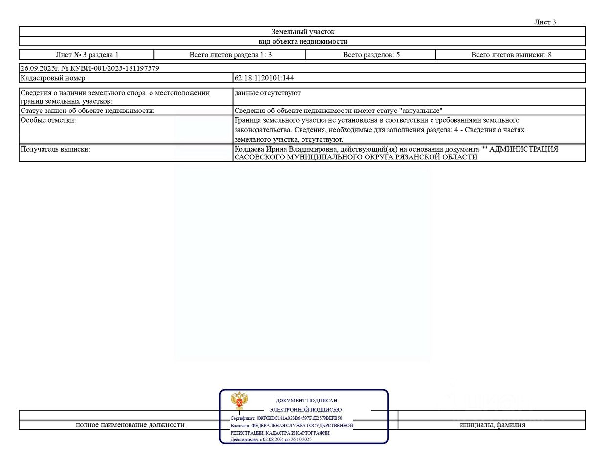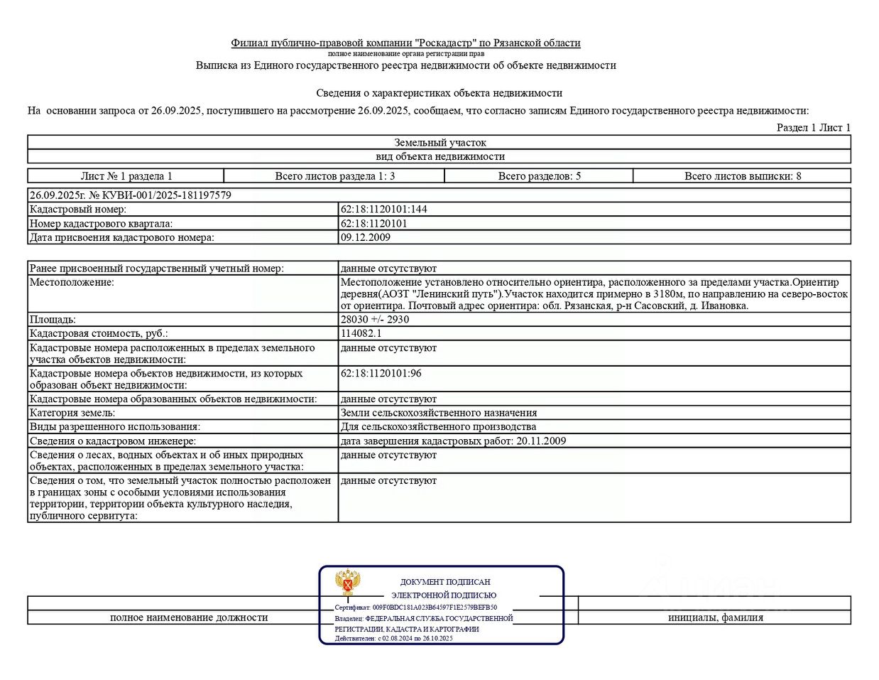 земельный участок с кадастровым номером 62:18:1120101:144, площадью 28030 кв.м, расположенный по адресу: Местоположение установлено относительно ориентира, расположенного за пределами участка. Ориентир деревня (АОЗТ "Ленинский путь"). Участок находится примерно в 3180 м, по направлению на северо-восток от ориентира. Почтовый адрес ориентира: обл. Рязанская, р-н Сасовский, д. Ивановка, категория земель: земли сельскохозяйственного назначения, вид разрешенного использования для с/х производства