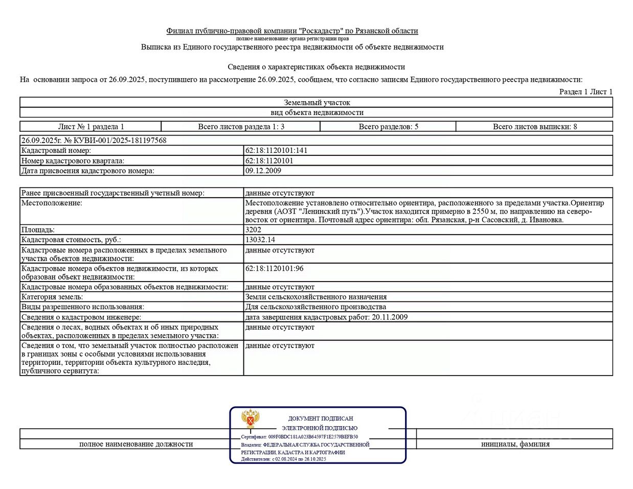 земельный участок с кадастровым номером 62:18:1120101:141, площадью 3202 кв.м, расположенный по адресу: Местоположение установлено относительно ориентира, расположенного за пределами участка. Ориентир деревня (АОЗТ "Ленинский путь"). Участок находится примерно в 2550 м, по направлению на северо-восток от ориентира. Почтовый адрес ориентира: обл. Рязанская, р-н Сасовский, д. Ивановка, категория земель: земли сельскохозяйственного назначения, вид разрешенного использования для с/х производства