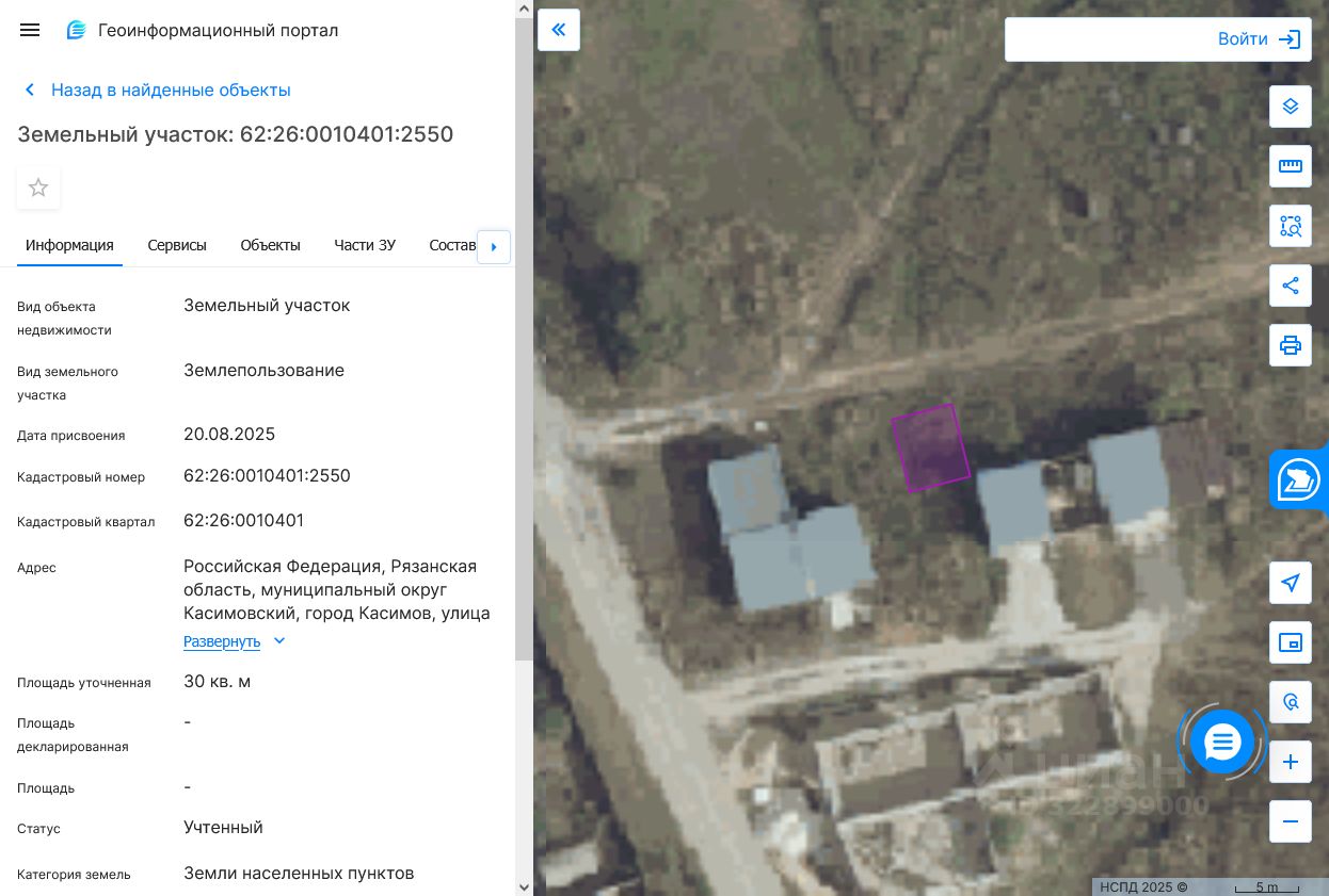 Земельный участок с кадастровым номером 62:26:0010401:2550 площадь 30 по адресу Российская Федерация, Рязанская область, муниципальный округ Касимовский, город Касимов, улица Прохладная, земельный участок 15/4