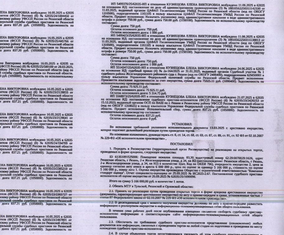 Помещение, назначение: нежилое, наименование: нежилое помещение, площадь 83,3 кв.м., кадастровый номер 62:29:0070029:1626, местоположение: Рязанская область, г Рязань, 2-я Железнодорожная улица, д 34, кв. Н2. Вид ограничений (обременений): аренда в пользу ООО "ВЕД" (ИНН 6230117822) на основании Договора купли-продажи от 15.01.2021. Взыскатель: ЦАФАП Госавтоинспекции УМВД России по Рязанской обл., Казначейство России и др. Начальная цена: 5 166 000 (Пять миллионов сто шестьдесят шесть тысяч) руб. 00 коп., без НДС. Задаток: 2 500 000 (Два миллиона пятьсот тысяч) руб. 00 коп. Шаг аукциона 1%: 51 660 (Пятьдесят одна тысяча шестьсот шестьдесят) руб. 00 коп.