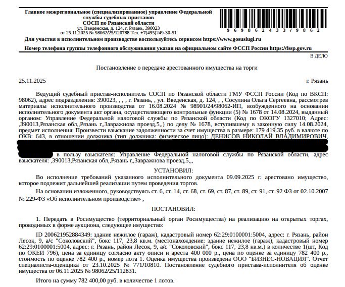 Здание, назначение: нежилое, наименование: здание, площадь 23,8 кв.м., кадастровый номер 62:29:0100001:5004, адрес: Рязанская область, г Рязань, район Лесок, 9, а/к "Соколовский", бокс 117. Здание расположено в пределах земельного участка с кадастровым номером 62:29:0100001:77, сведениями о правообладателе Организатор торгов не располагает, предоставлен ГСК "Соколовский" по договору аренды А 074-10 от 16.06.2010. Взыскатель: УФНС по Рязанской области. Начальная цена: 782 400 (Семьсот восемьдесят две тысячи четыреста) руб. 00 коп., без НДС. Задаток: 380 000 (Триста восемьдесят тысяч) руб. 00 коп. Шаг аукциона 1%: 7 824 (Семь тысяч восемьсот двадцать четыре) руб. 00 коп.
