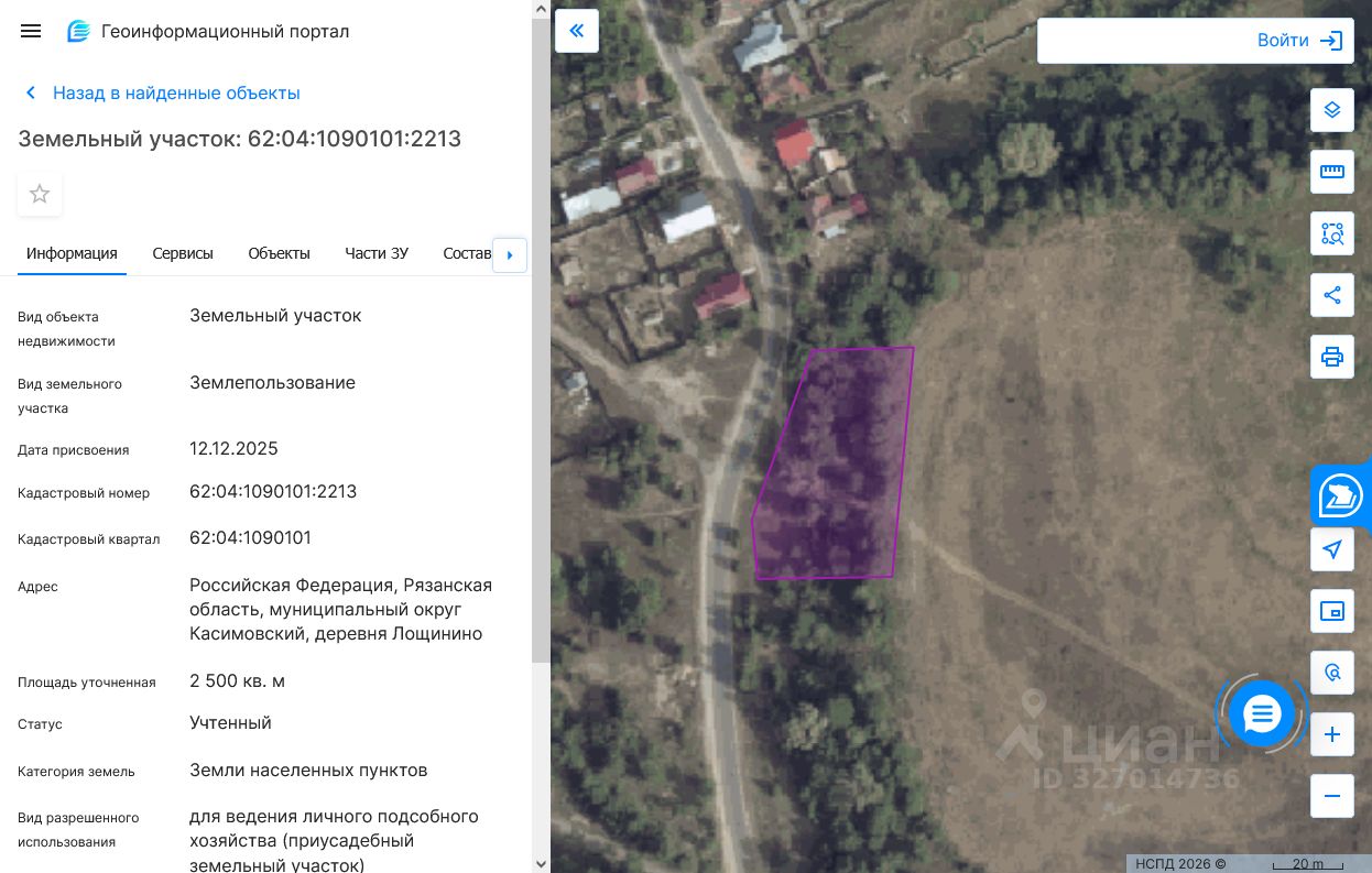 Земельный участок с кадастровым номером 62:04:1090101:2213 площадь 2500 по адресу Российская Федерация, Рязанская область, муниципальный округ Касимовский, деревня Лощинино