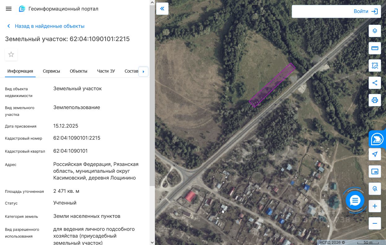 Земельный участок с кадастровым номером 62:04:1090101:2215 площадь 2471 по адресу Российская Федерация, Рязанская область, муниципальный округ Касимовский, деревня Лощинино